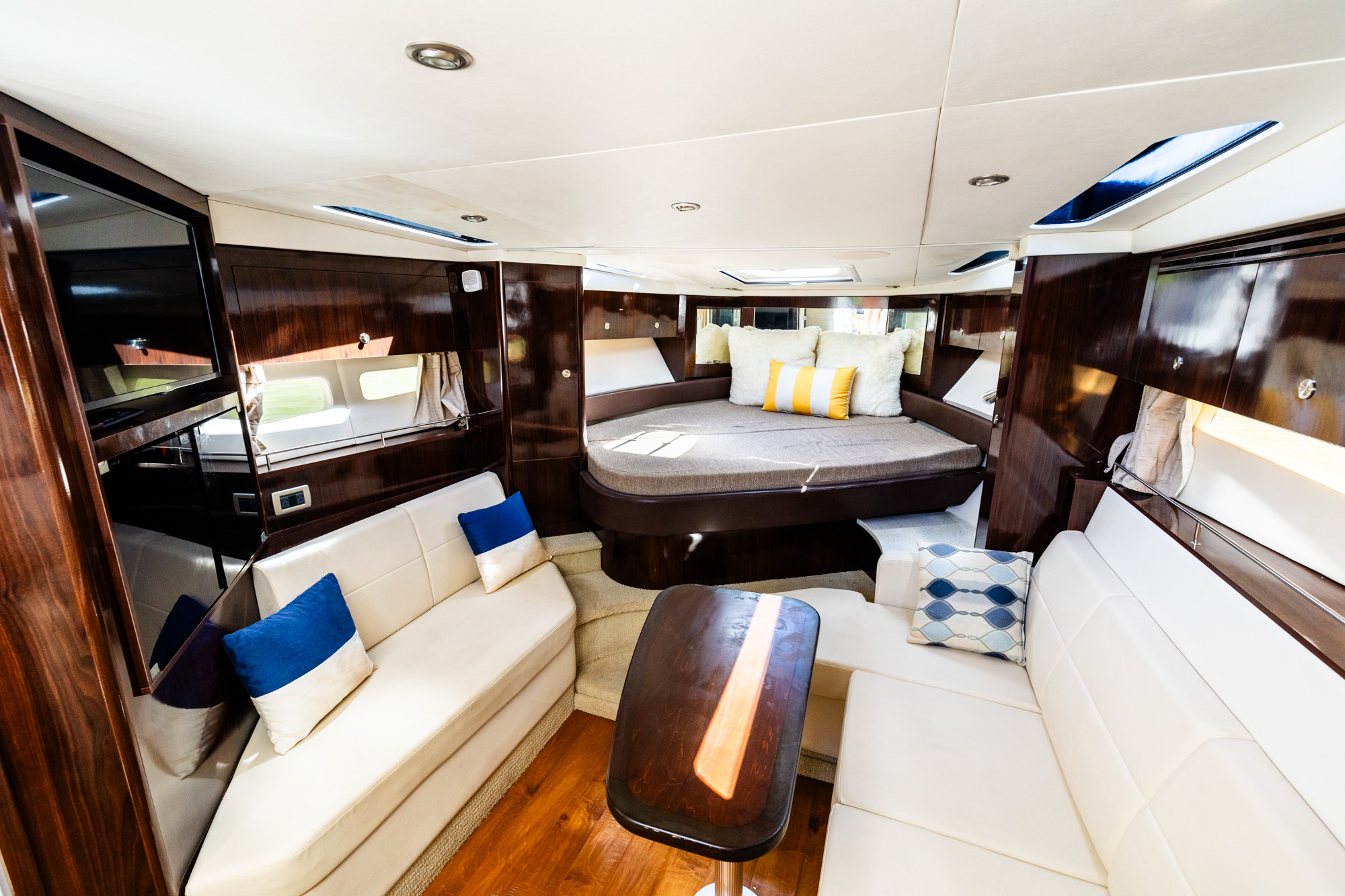 The 2016 Sea Ray Sundancer 350 is a stylish and luxurious cruiser designed for both performance and comfort. Powered by twin MerCruiser engines, it offers a smooth and powerful ride, ideal for both leisurely cruises and water sports.